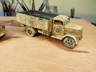 Also worked on some ww2 stuff in september. The early war germans aren't done yet but the trucks are finished. Turned out so-so as the windows was ruined by the matt coat finish. I should have known but hey, better luck next time I guess. Was to lazy to add decals so I hand painted them quickly instead. Will add passengers later on.